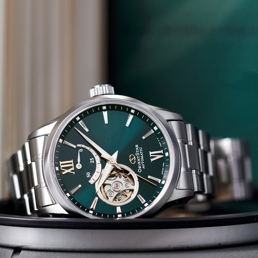 The Semi Skeleton of limited-edition model from the series incorporating dial colours representing the sky and the sea connecting the world, began with the desire of Orient Star to be worn by people around the globe. Inspired by the seaside at dawn, the model depicts beautiful sea and sky scenes just after the sun has risen. The pink gold colour on the bezel, hands, and indices symbolises the warm light of the sun, while the gradation from green in the center of the dial to navy blue on the outer edges symbolises the emerald green of the lapping waves and the dark blue of the sky. And it is striking 39.3mm stainless steel mechanical watch, showcasing a dial with semi-skeleton view, alluring hands with luminous accents, a power reserve sub-dial, and a classic hand-wound crown with automatic self-winding functionality. The impeccable craftsmanship of the case and chapter ring elegantly frame the meticulous movement of the watch, protected by sapphire crystal. Anti-reflective coating glass delivers increased visibility, suppressing reflection while adding scratch and stain resistance. It supports a continuous running time of 50 hours and water resistance of 100 meters.