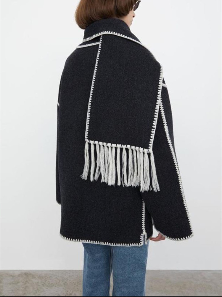 Women Fringe Scarf Collar Coat Double-sided Woolen Single Breasted Autumn Winter 2022 Loose Embroidery Trim Female Casual Jacket