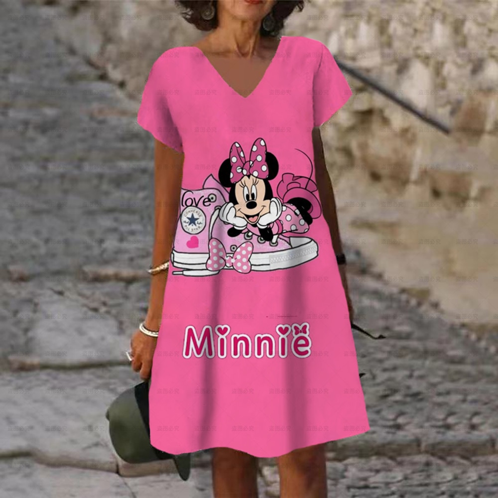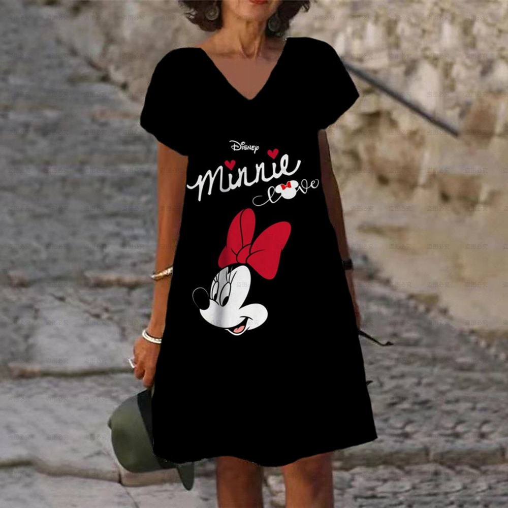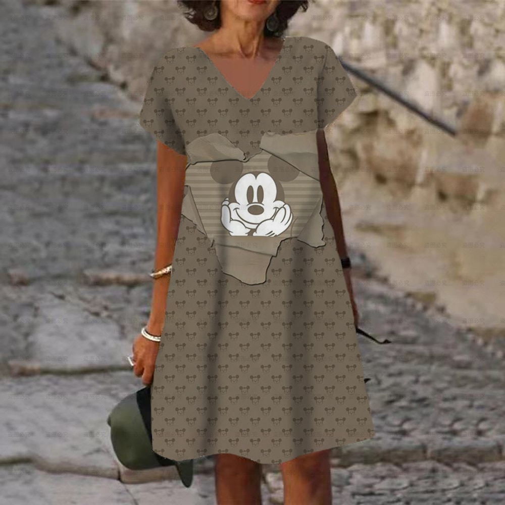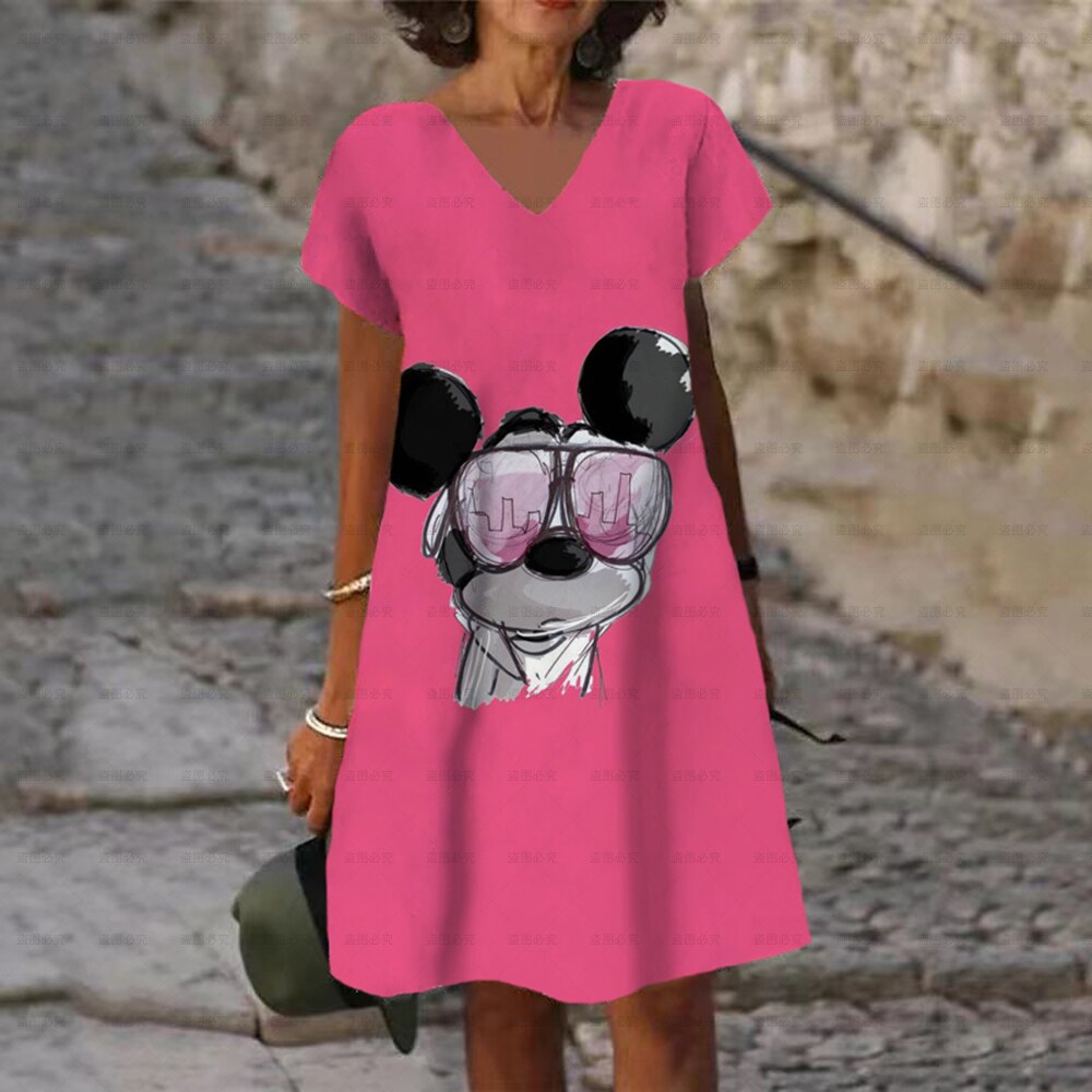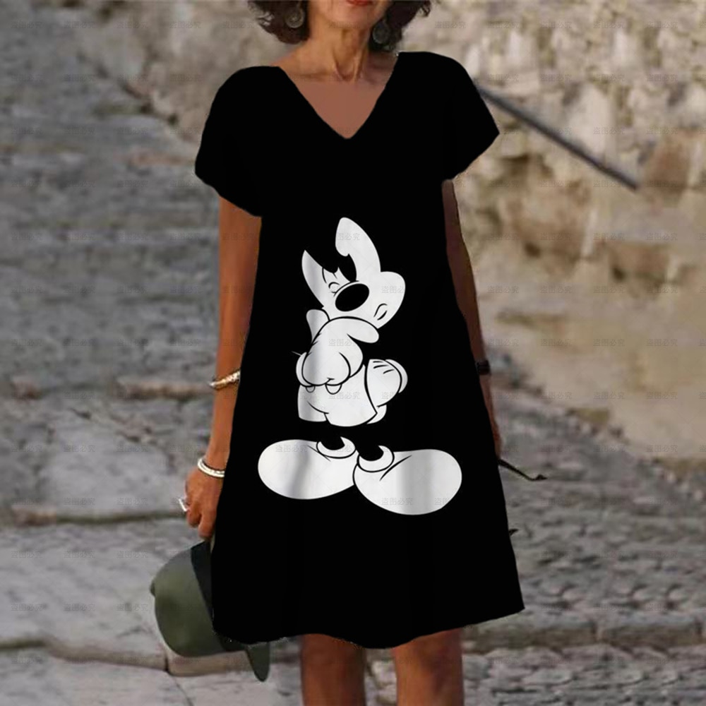 Ladies New Party Autumn Sexy Mini Dresses Disney Mickey Mouse Printed V-neck Dress XS-5XL Short Sleeve Women Knee Length Dress
