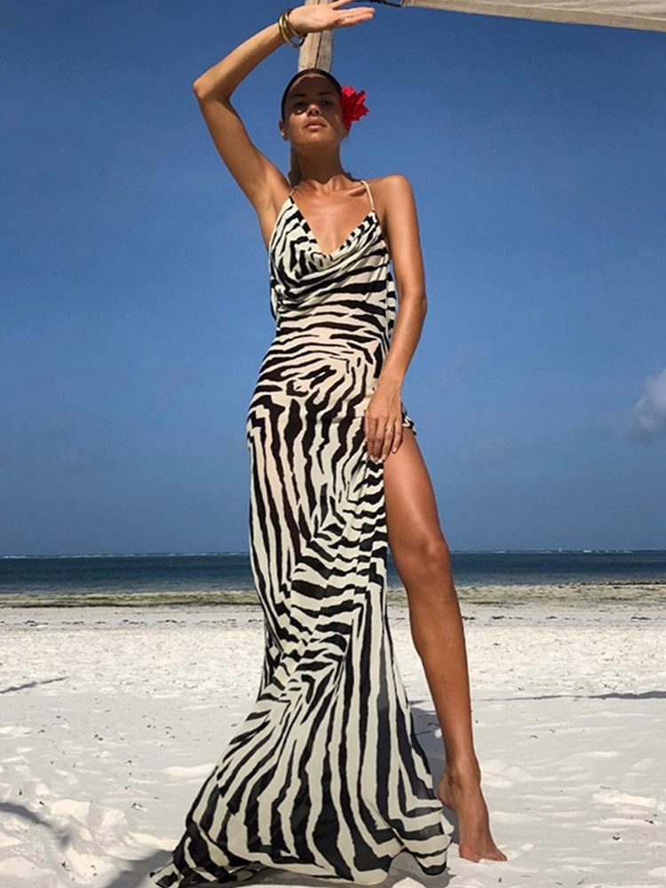 Sexy Spaghetti Strap Side Split Beach Dress Summer Sundress Women Clothes Elegant Zebra Back Open Club Party Dresses