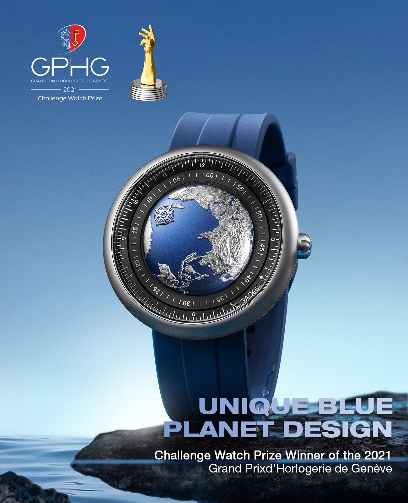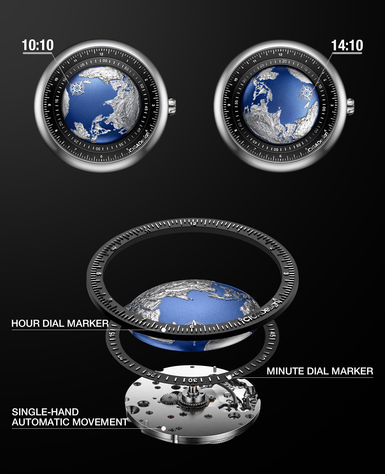 We use Micro-carving tech to rebuild the landform of our Earth. You can feel the greatness of the mountains, the ocean and other natural elements through this little earth on your wrist. And it also reminds us to protect the natural world on the Earth.
