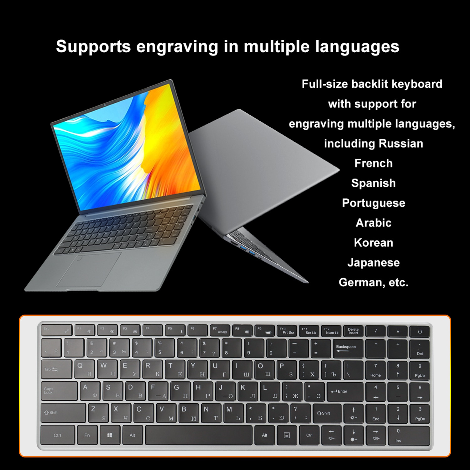 This product supports laser engraving languages on the keyboard, including Russian, French, Spanish, German, Korean, Japanese, Arabic, etc., except for Russian, engraving other languages requires an additional charge of 10 USD, if you need engraving, you can contact us, thank you.