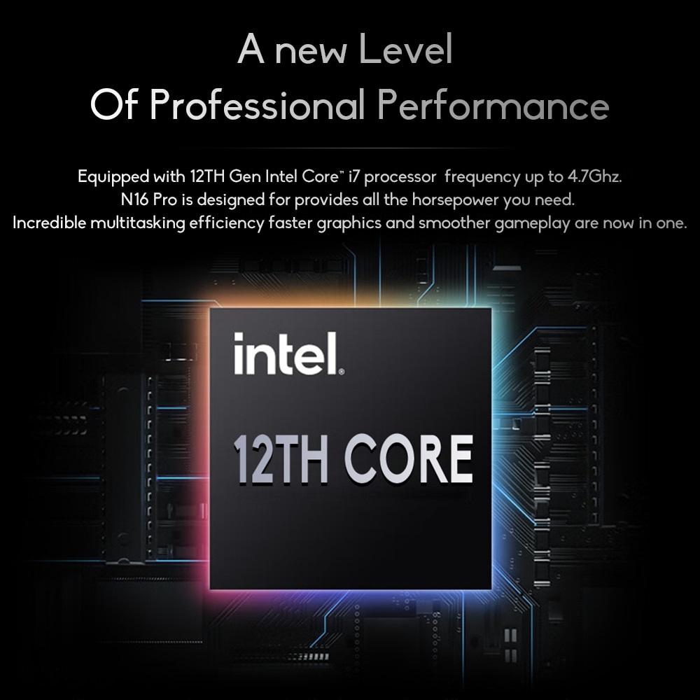 The N16 Pro is equipped with Intel Core i7 1260P central processor with a base frequency of 2.1Ghz and a core frequency of up to 4.7Ghz, 18MB of Level 3 cache, 12 cores, 12 threads, multiple cores and multiple threads to help you better handle multiple tasks, even if you run multiple programs in the background, it will not easily lag.