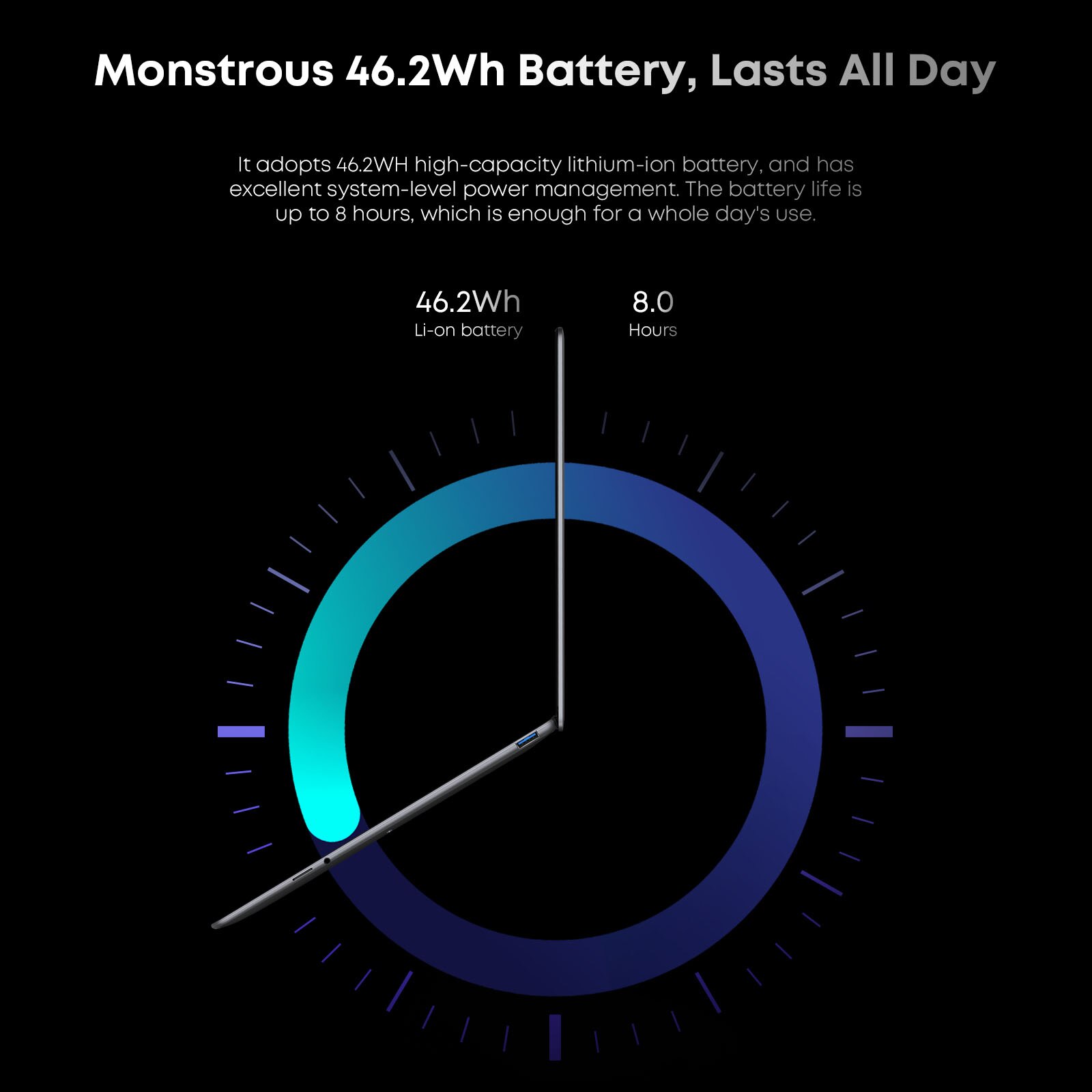 The compact, light, and thin metal design: An ultralight 2.99lbs chassis—so you can enjoy outstanding portability wherever you are. The 46.2Wh battery life is up to 8 hours, which is enough for a whole day's use.