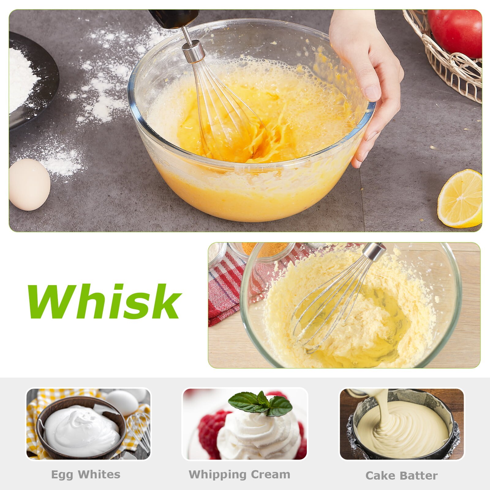 • 4-in-1 Ergonomic Immersion Hand Blender Including Hand Blender, 500ml chopper bowl, 700ml measuring cup, and egg whisk. Perfect for baby foods, soups, smoothies, ée, and more. Ergonomic handles support one-handed operation with ease and help you to make the food preparation process faster and easier.