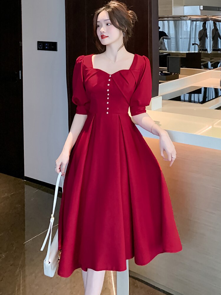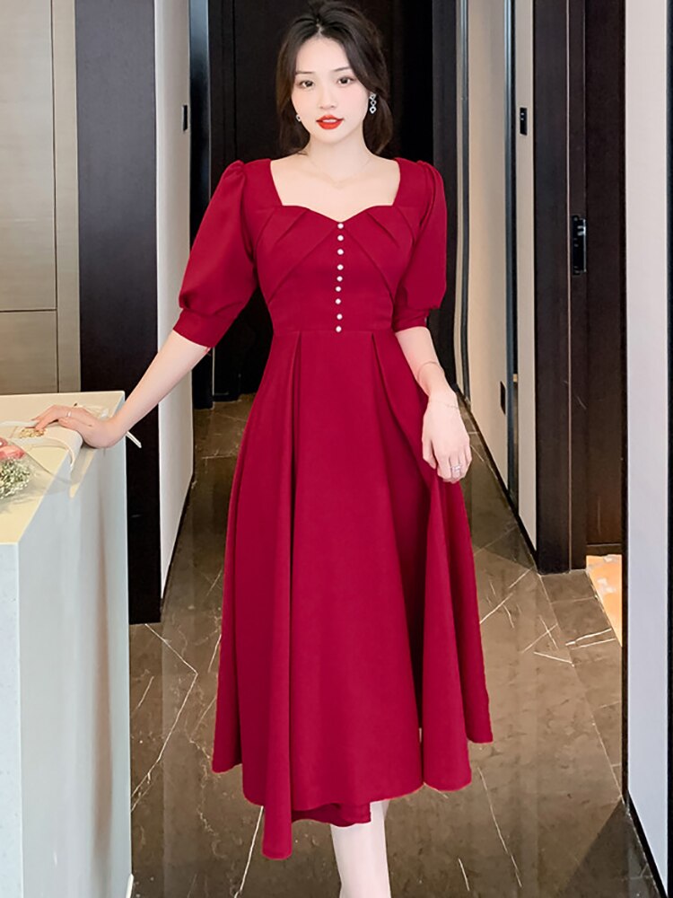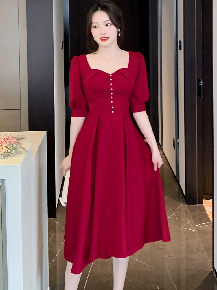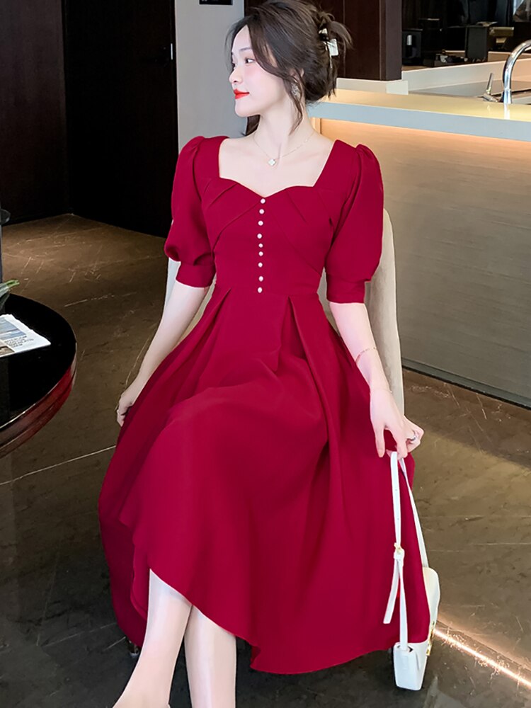 HUTI WJWYL New Arrival High Quality Women Red Puff Sleeve Square Collar Wedding Dress Summer Fashion Luxury Elegant Long Dress Korean Vintage Bodycon Vestidos
