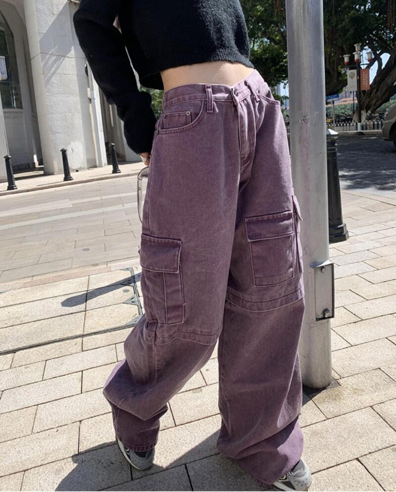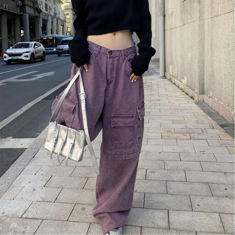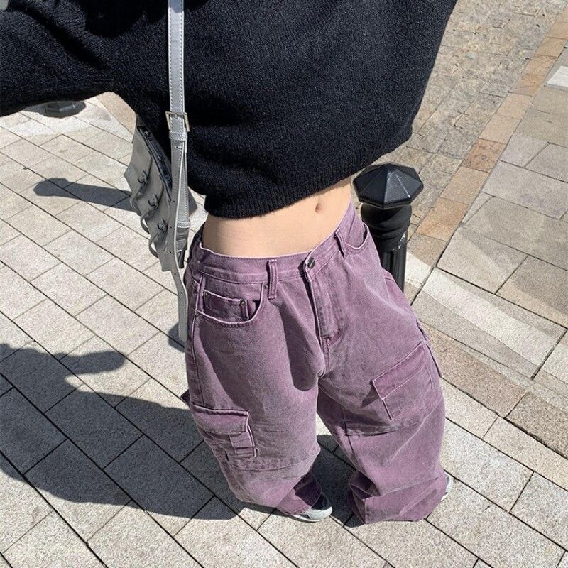 Purple Oversized Pocket Cargo Denim Pants Y2K Streetwear High Waist Straight Baggy Jeans Fashion Oversized Wid Leg Trousers