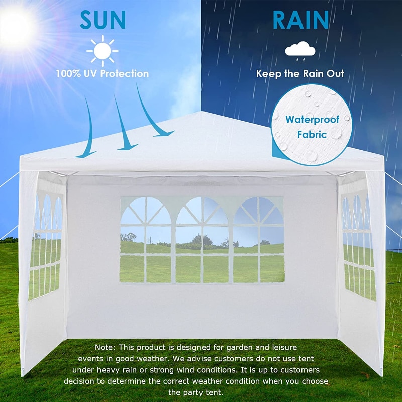 LARGE SPACE: 10x10 feet with 3 sidewalls White Wedding Party Tent provides 100 square feet of shade coverage, 6 to 10 people at the same time for any outdoor events.